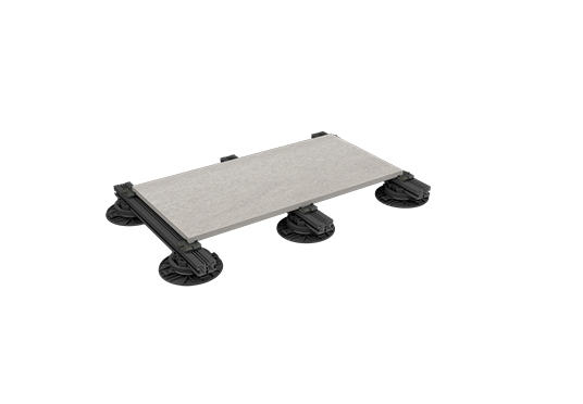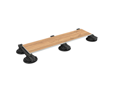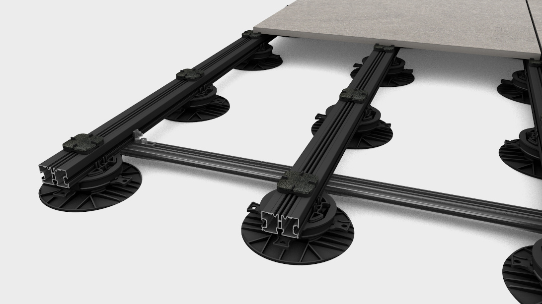 Ce procédé ingénieux repose sur un ensemble complet et parfaitement ajusté : plots réglables, rails en aluminium, supports de dalles et coussins amortisseurs. Chaque élément s’emboîte avec précision, sans colle ni joint, garantissant une pose rapide, stable et parfaitement plane.