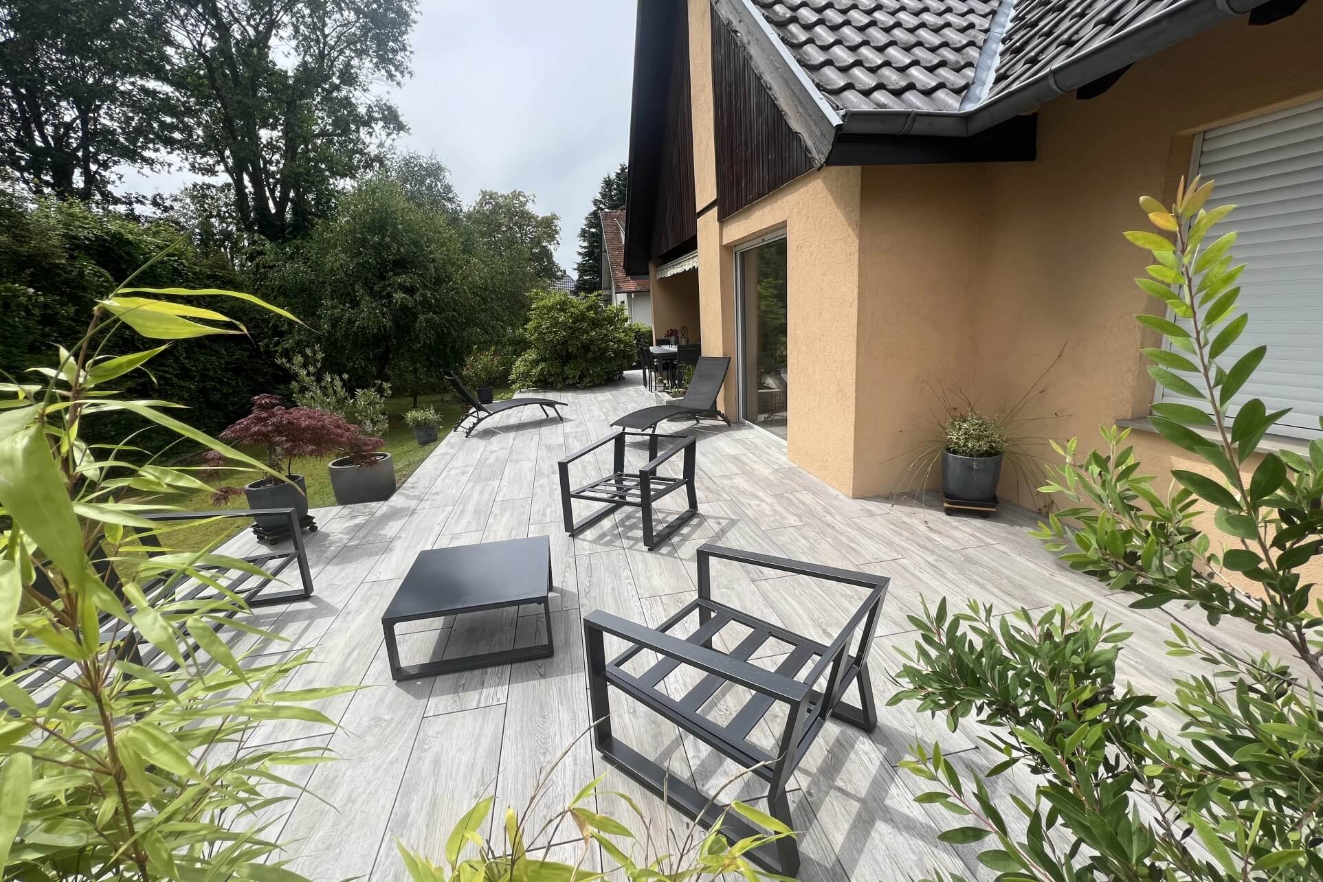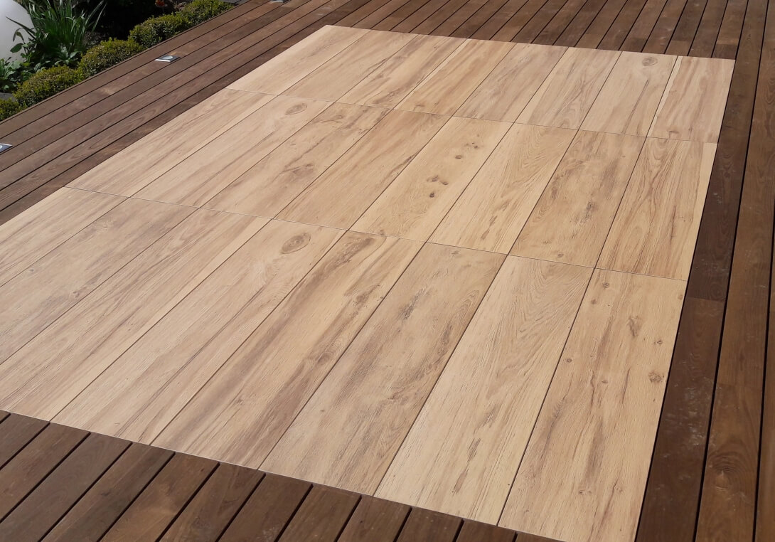 La structure permet de réaliser une terrasse mixte, combinant bois et grès cérame. Une solution élégante et pratique qui offre la chaleur du bois tout en profitant de la résistance du grès — idéale pour créer une zone barbecue sans craindre les taches de graisse.